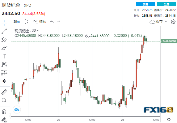 其他贵金属也纷纷上涨:现货白银涨幅扩大至1.5%,最高触及24.474美元;现货钯金大涨约3.8%,最高触及2450.22美元;现货铂金上涨近1.8%,至1094.54美元。