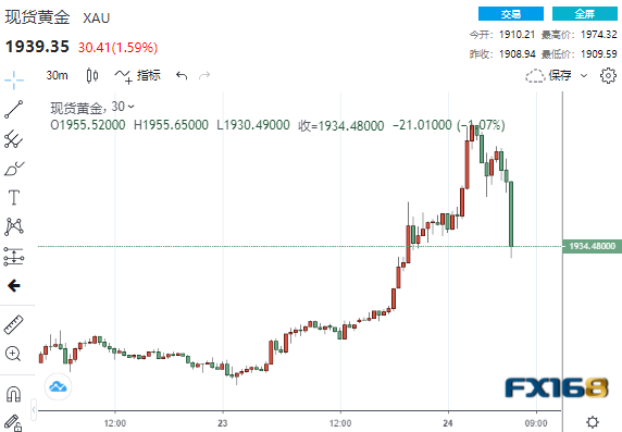 受市场避险情绪提振,现货金上涨3.4%,至1974.32美元,为2020年9月以来的最高水平,美市开盘后遭遇大量抛单打压,一度回落至1934.48美元。
