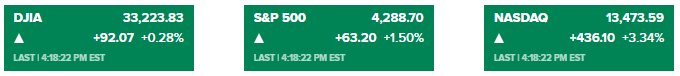 标普500指数收盘上涨1.5%,至4288.70点,日内稍早一度下跌超2.6%。道琼斯指数上涨92点,收于33223.83点,收复了之前下跌859点的失地。纳斯达克综合指数上涨3.3%,至13473.59点,盘中一度下跌近3.5%。