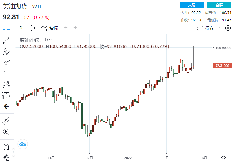 截至发稿,美国WTI原油期货上行0.73美元,涨幅0.79%,现报92.98美元/桶;布伦特原油期货上探1.98美元,涨幅2.04%,报99.26美元/桶。
