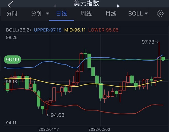 美元指数周四收报97.09,上涨0.91%,日内最高触及97.73。