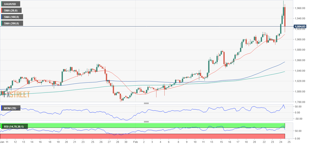 FX168财经报社(香港)讯 周五(2月25日)亚市早盘,现货黄金展开反弹,现报1912美元/盎司附近;昨日金价在暴涨之后上演“高台跳水”行情。FXStreet首席分析师分析师Valeria Bednarik撰文,对金价技术前景进行分析。Bednarik指出,对美元的需求引发黄金的大幅回调,不过,只要守住1900美元/盎司,金价后市仍有大涨空间。