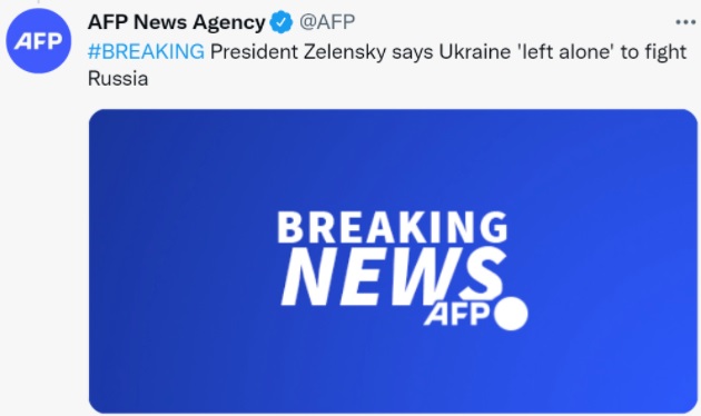 法新社报道称,乌克兰总统泽连斯基称,乌克兰在“孤军奋战”对抗俄罗斯。