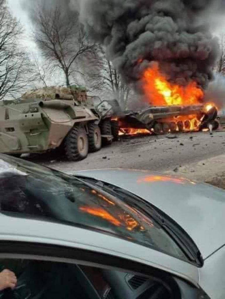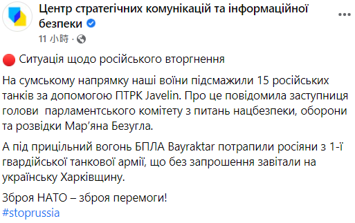 乌克兰“战略通讯和讯息安全中心”在脸书上发布画面,照片中一辆装甲车起火燃烧,上半部车身已经全毁,砲塔被炸飞至一旁,下半部车身则看似仅存车架。该贴文表示,乌国军队利用美制标枪(Javelin)反装甲飞弹击毁15量俄国装甲车,并直呼“北约的武器是胜利的武器”。