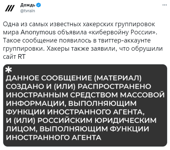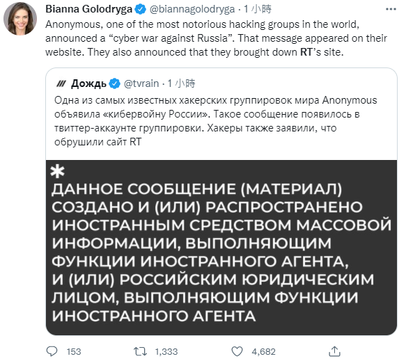 FX168财经报社(香港)讯 综合多家俄媒报道,匿名黑客组织在海外社交媒体推特上宣布对俄罗斯发动“网络战争”,声称对今日俄罗斯电视台(RT)遭受的网络攻击负责。法国出现禁播呼声,而德国也已经提前下架该媒体。
