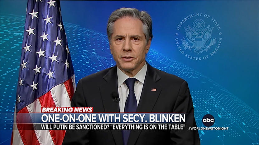 在美国广播公司(ABC)“orld News Tonight”节目的采访中,主持人David Muir问布林肯,他是否确信普京会推翻乌克兰政府。