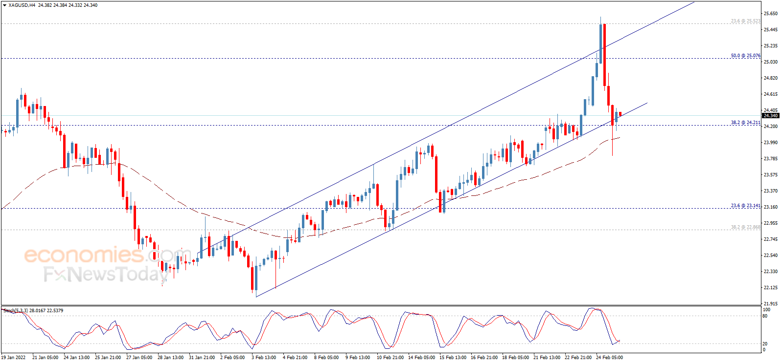 Economies.com预计,今日银价交投将位于支撑位23.80美元/盎司以及阻力位25.00美元/盎司之间。