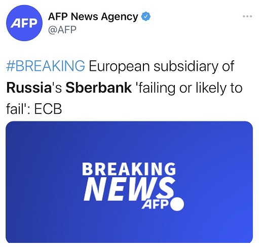 欧洲央行表示,Sberbank Europe AG“很可能无法支付其债务或其他到期债务。”这家银行是俄罗斯联邦储蓄银行的全资子公司,后者的大股东是俄罗斯政府。