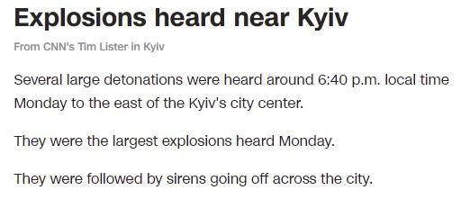 FX168财经报社(北美)讯 据CNN报道,当地时间周一(2月28日)下午6点40分左右,在乌克兰首都基辅市中心以东听到了几起大爆炸声。这是周一听到的最大的爆炸声,紧随其后的是整个城市的警笛声。