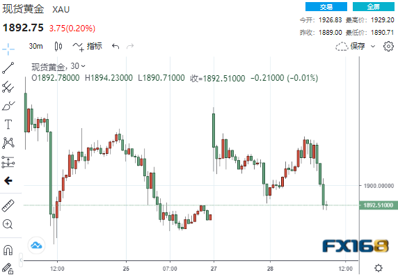 美市盘中,现货黄金持续自高位回落,一度较日高回落近39美元,触及1890.71美元,盘中早些时候曾上涨2.2%。