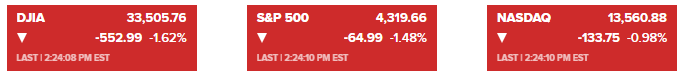 道琼斯指数下跌超500点或1.5%。标普500指数和纳斯达克综合指数分别下跌近1.5%和1%,此前两者曾短暂上扬。
