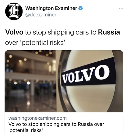 《纽约时报》指出,尽管沃尔沃在俄罗斯的销售只占沃尔沃全球总销量的1%,比美国纽约州规模还小,但由于风险不断增加,会让许多企业放弃这个市场。