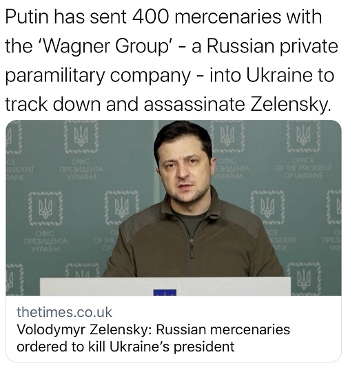 英国《泰晤士报》周一(2月28日)报道称,《泰晤士报》获悉,400多名俄罗斯雇佣军正在基辅行动,奉克里姆林宫之命暗杀泽连斯基总统及其政府,为莫斯科夺取控制权做准备。
