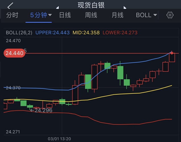 24K99讯 周二(3月1日)亚市尾盘,现货白银短线急涨,银价现报24.45美元/盎司附近。知名财经资讯网站Economies.com周一最新撰文,对日内白银走势进行前瞻分析。