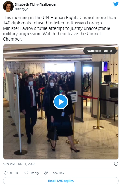FX168财经报社(北美)讯 周二(3月1日),当俄罗斯外长拉夫罗夫在联合国人权理事会发表讲话时,100多名外交官纷纷离席以示抗议。此前,他在附近的裁军谈判会议上的讲话遭到了类似的抵制。