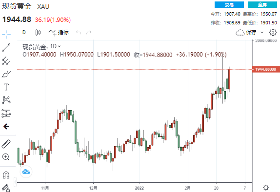 在2月份上涨约120美元后,黄金在3月首个交易日大幅上涨。美市尾盘,现货黄金收报1944.88美元/盎司,大涨36.19美元或1.90%,日内最高触及1950.07美元,最低触及1901.50美元。