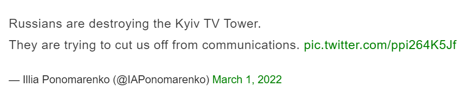 基辅市长克里契科(Vitali Klitschko)指出,电视塔遭到两枚火箭攻击,造成附近5名行人丧生,由于俄罗斯扬言对基辅发动攻击,他也呼吁居民不要待在街上。基辅市紧急服务单位在网路分享的视频显示,率先赶抵现场的应急人员走过掉落的电力线,试图扑灭电视塔下建筑物瓦砾堆中的大火。