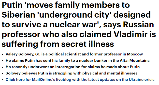 索洛维说,普丁将家人送到掩体是因征服乌克兰的战略计划失败。他没有透露被送走的家人是谁,但他曾称,外传为普京情妇的38岁奥运金牌体操选手爱丽娜·卡巴耶娃是普京“真正的家人,有能力影响他的决定”。另有传言称,卡巴耶娃曾替普丁生下孩子,但遭克里姆林宫否认。